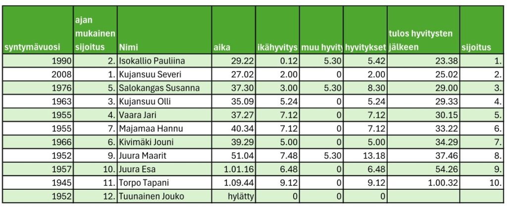 Kilpailuun osallistui 12 suunnistajaa, joista 11 sai hyväksytyn tuloksen. Tuloksen saaneista 10 oli seuran jäseniä, joten heidät otettiin huomioon tuloksia muodostettaessa. Nopeimmin radan kiersi Severi Kujansuu, mutta ikä- ja sukupuolihyvitysten laskemisen jälkeen seuranmestariksi todettiin Pauliina Isokallio.